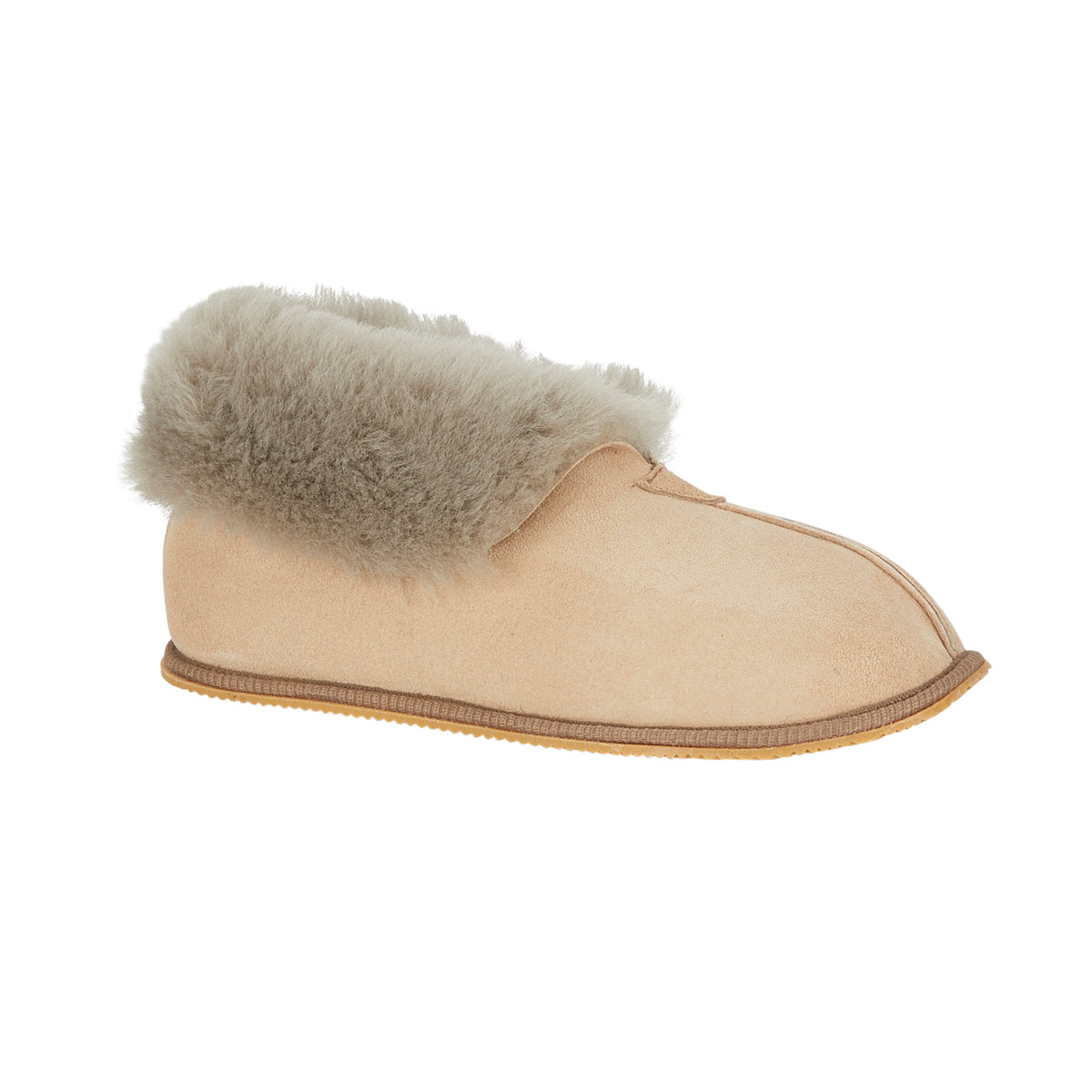Our new and improved ladies boot slipper. Made with a double faced sheepskin upper, sheepskin lining and flexible rubber sole. Improved fitting and a more flexible sole. Made in England.
