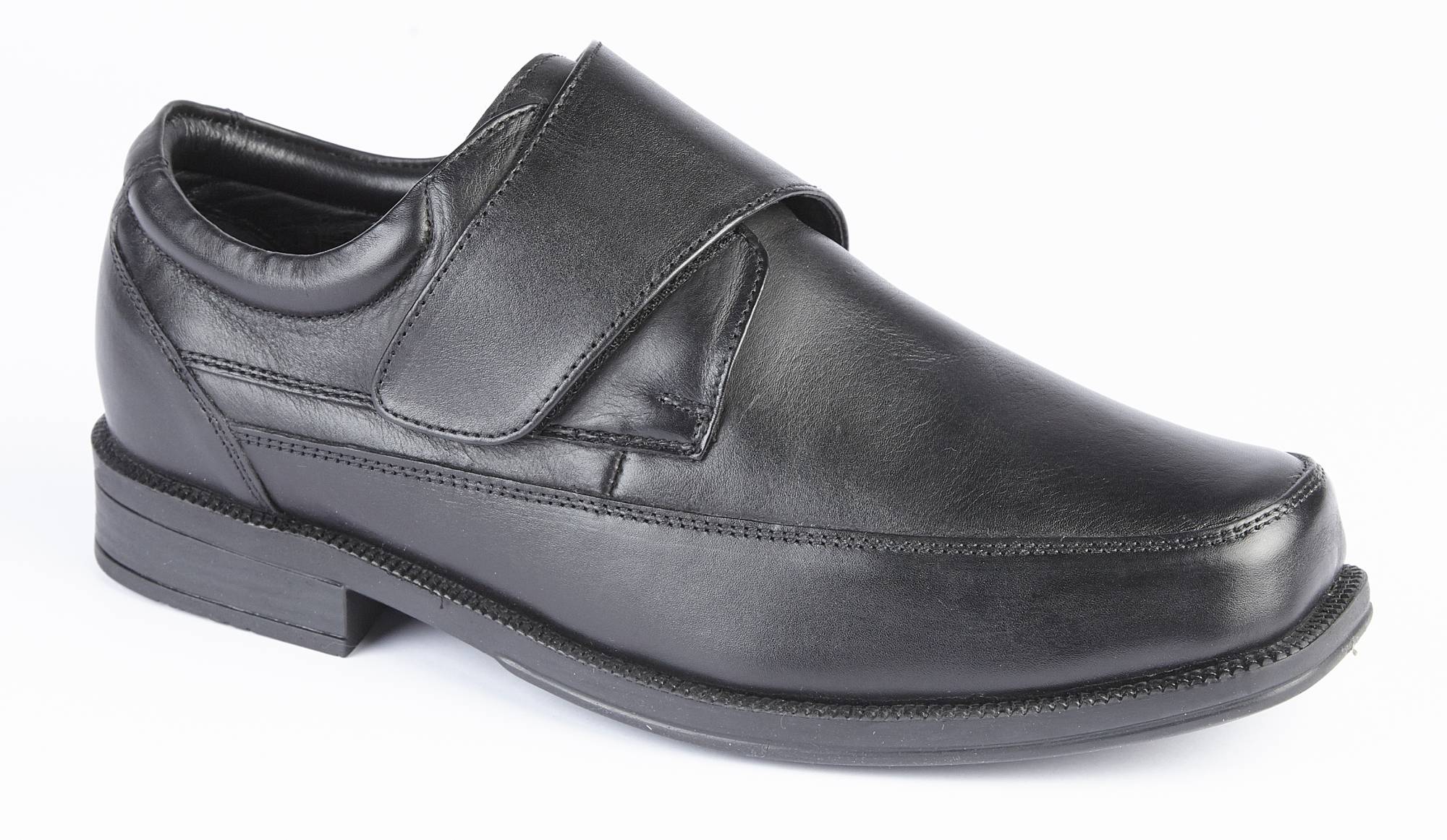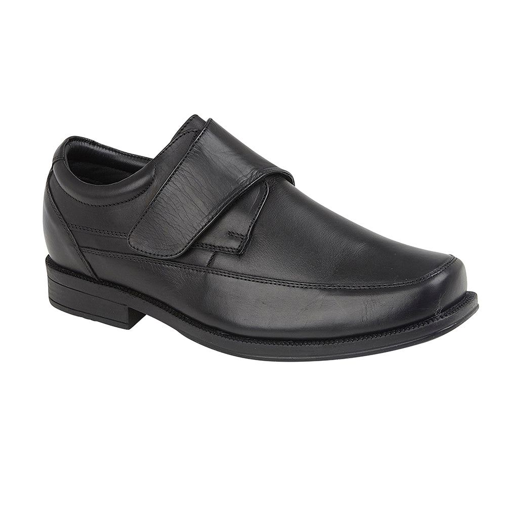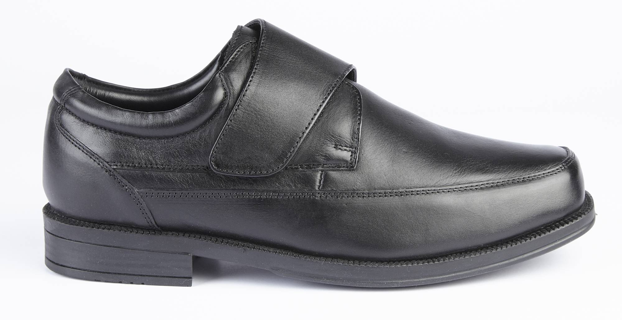 A velcro fastening monk shoe, with genuine soft leather upper, soft leather lining, and cushioned leather insole. There is plenty of room at the toe area, and it has a rubber sole with a one inch heel. It is an H Fitting shoe (wider than regular)