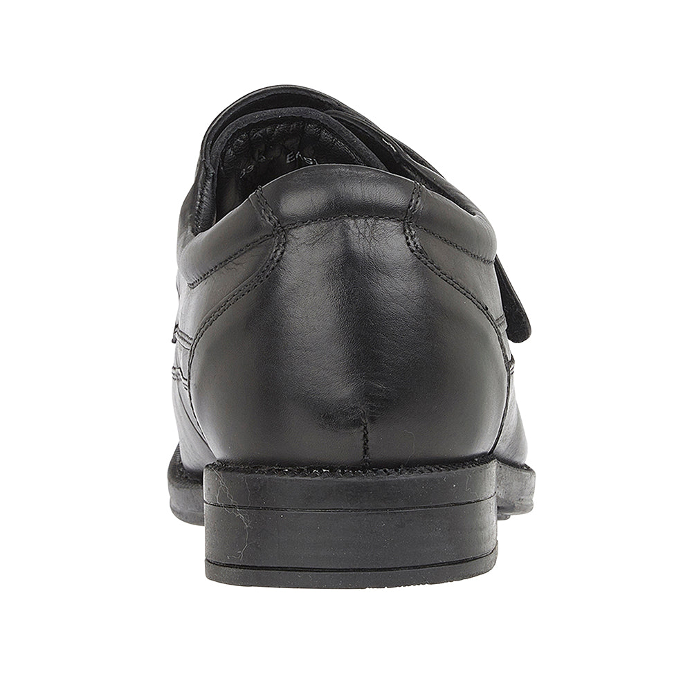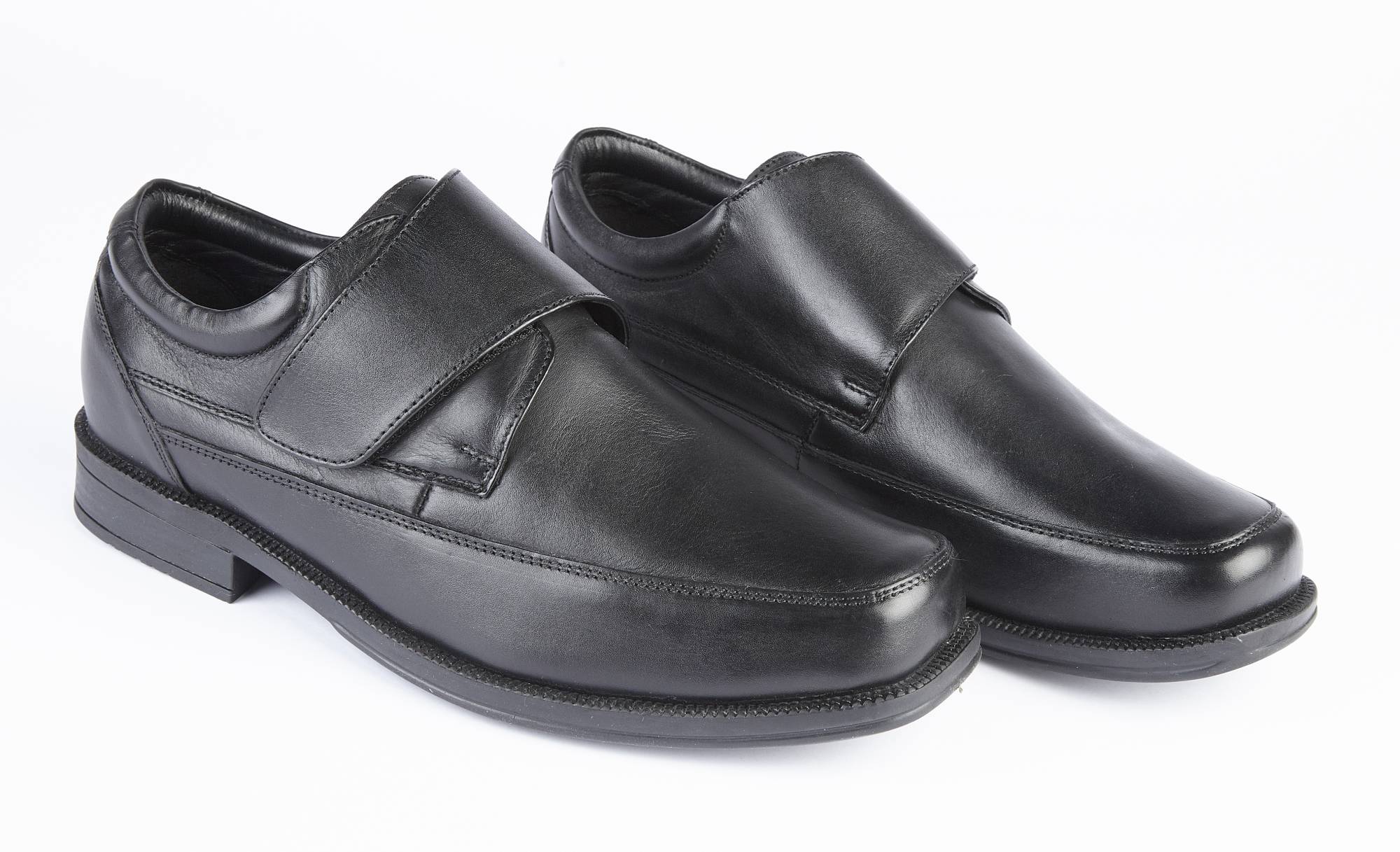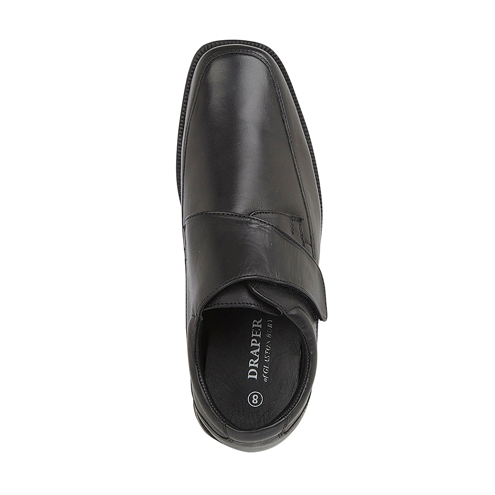 A velcro fastening monk shoe, with genuine soft leather upper, soft leather lining, and cushioned leather insole. There is plenty of room at the toe area, and it has a rubber sole with a one inch heel. It is an H Fitting shoe (wider than regular)