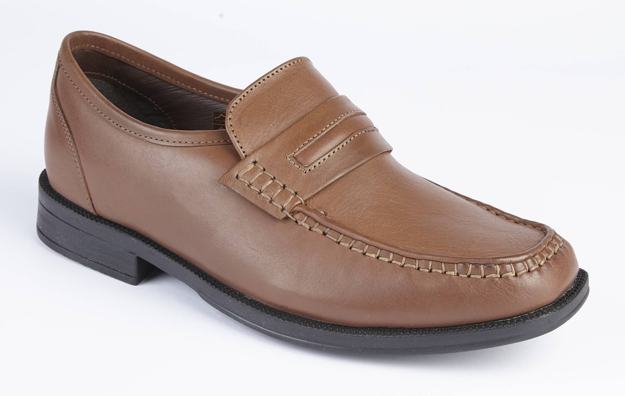 Our men's loafer, with a soft leather upper, soft leather lining, and cushioned leather insole. It has plenty of room at the toe area, and a rubber sole with a one inch heel. It is an H fitting shoe (wider than regular)