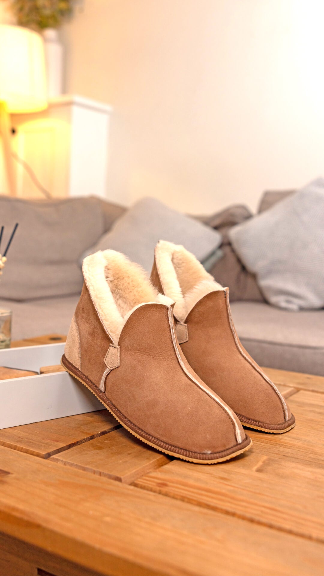 At first, it is normal for sheepskin lined slippers and boots to feel a little tight. The sheepskin will bed down and mould to the shape of your foot and feel completely normal with a short amount of wear, so this is nothing to worry about. We recommend ordering your normal shoe size. If you are a half size, then we recommend buying a size up.